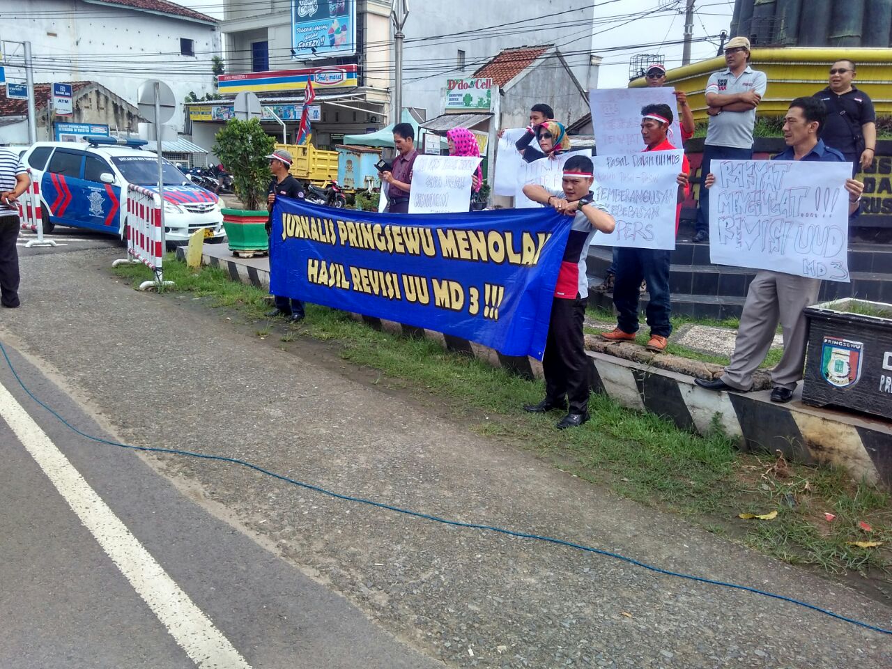 Salah satu jurnalis dalam orasinya mengatakan Seluruh jurnalis pringsewu sepakat menolak adanya UUMD3 pasal 73 ayat 1,2,3 yang salah satu bunyinya ayat 3 "DPR bisa melakukan pemanggilan paksa terhadap orang perseorangan, kelompok orang, dan instansi tertentu dengan meminta bantuan kepolisian".